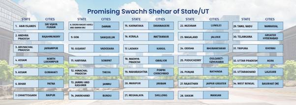 स्वच्छ सर्वेक्षण 2024-25 पुरस्कार समारोह में केंद्रीय मंत्री मनोहर लाल ने प्रयागराज को सर्वश्रेष्ठ गंगा शहर का पुरस्कार प्रदान किया, जबकि सिकंदराबाद छावनी को उसके स्वच्छता प्रयासों के लिए सर्वश्रेष्ठ छावनी बोर्ड के रूप में सम्मानित किया गया। ग्रेटर विशाखापत्तनम नगर निगम (जीवीएमसी), विशाखापत्तनम, जबलपुर और गोरखपुर को सफाई कर्मचारियों को सुरक्षा और गरिमा प्रदान करने की उत्कृष्ट प्रतिबद्धता के लिए सर्वश्रेष्ठ सफाई मित्र सुरक्षित शहर घोषित किया गया। अनुमानित 66 करोड़ लोगों के भाग लेने वाले विश्व के सबसे बड़े महाकुंभ के दौरान बेहतरीन शहरी अपशिष्ट प्रबंधन के लिए उत्तर प्रदेश सरकार, प्रयागराज मेला अधिकारी और प्रयागराज नगर निगम को विशेष पुरस्कार दिये गये।