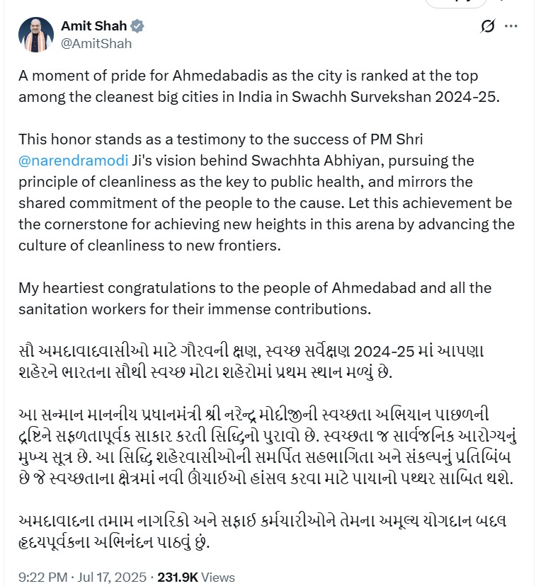 Ahmedabad News (18/07/2025): केन्द्रीय गृह एवं सहकारिता मंत्री अमित शाह (Union Minister Amit Shah) ने स्वच्छ सर्वेक्षण 2024-25 में अहमदाबाद को भारत के सबसे स्वच्छ बड़े शहरों में शीर्ष स्थान प्राप्त करने में असीम योगदान के लिए अहमदाबाद के लोगों को बधाई दी है।