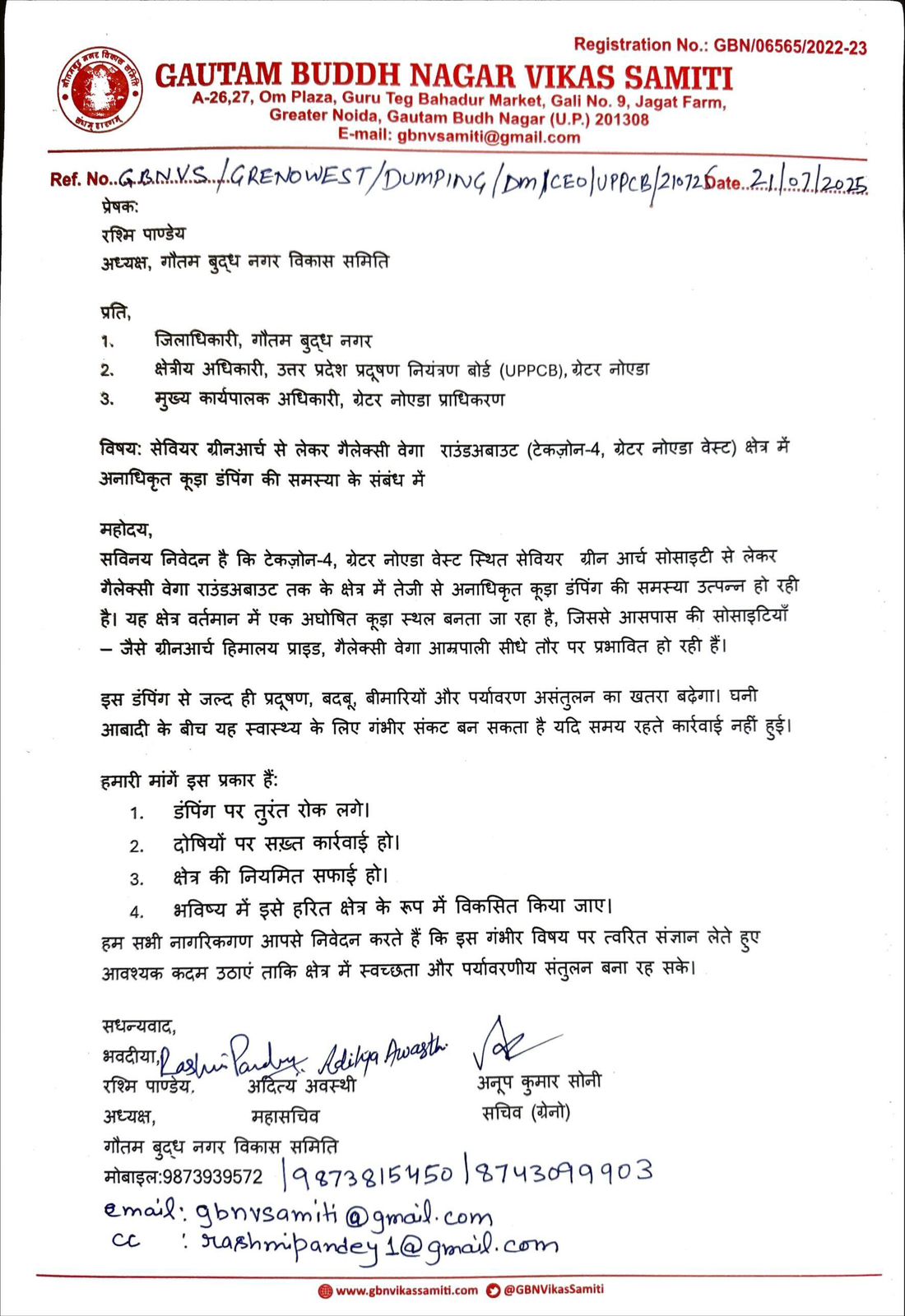 GREATER NOIDA News (22/07/2025): ग्रेटर नोएडा वेस्ट के टेकज़ोन-4 स्थित सेवियर ग्रीनआर्च (Saviour Greenarch) से गैलेक्सी वेगा राउंडअबाउट इकोटेक क्षेत्र में अनाधिकृत रूप से कूड़ा डंपिंग (Garbage Dumping) की बढ़ती समस्या को लेकर गौतम बुद्ध नगर विकास समिति (Gautam Buddha Nagar Development Committee) ने 22 जुलाई को जिलाधिकारी, उत्तर प्रदेश प्रदूषण नियंत्रण बोर्ड और ग्रेटर नोएडा प्राधिकरण को पत्र प्रेषित किया था।