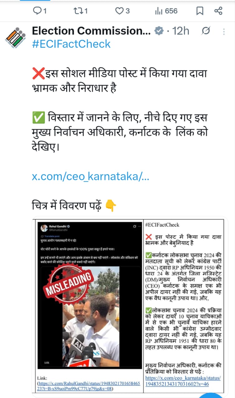 विपक्ष के इन आरोपों पर चुनाव आयोग ने सख्त प्रतिक्रिया दी है। आयोग ने राहुल गांधी के बयानों को “बेबुनियाद और भ्रामक” बताते हुए सिरे से खारिज कर दिया। आयोग ने कहा कि मतदाता सूची की प्रक्रिया पूरी पारदर्शिता के साथ चलाई जा रही है, और यह किसी भी राजनीतिक दबाव में नहीं आती। साथ ही चुनाव आयोग ने यह भी स्पष्ट किया कि इस मामले में केरल हाई कोर्ट में पहले से सुनवाई चल रही है, और राहुल गांधी को किसी भी निष्कर्ष पर पहुँचने से पहले न्यायालय के फैसले का इंतजार करना चाहिए। वो भारत के एक संवैधानिक संस्था को धमकाने की कोशिश कर रहे है। आयोग ने यह बयान देकर यह संकेत दिया कि वह किसी राजनीतिक हमले से डरने वाला नहीं है।