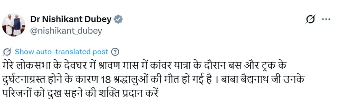 देवघर/झारखंड (29/07/2025): देवघर में कांवड़ यात्रा के दौरान एक दर्दनाक सड़क हादसे में एक बस और ट्रक की जोरदार टक्कर हो गई, जिसमें पांच कांवड़ियों की मौके पर ही मौत हो गई, जबकि कई अन्य घायल हो गए हैं। संथाल परगना के जोनल आईजी एस.के. सिन्हा ने हादसे की पुष्टि करते हुए बताया कि घायलों को अस्पताल में भर्ती कराया गया है और अधिक जानकारी की प्रतीक्षा है। वहीं सांसद निशिकांत दुबे (Nishikant Dubey) ने इस घटना को अत्यंत दुखद बताते हुए कहा कि इस दुर्घटना में कुल 18 श्रद्धालुओं की मौत हुई है।