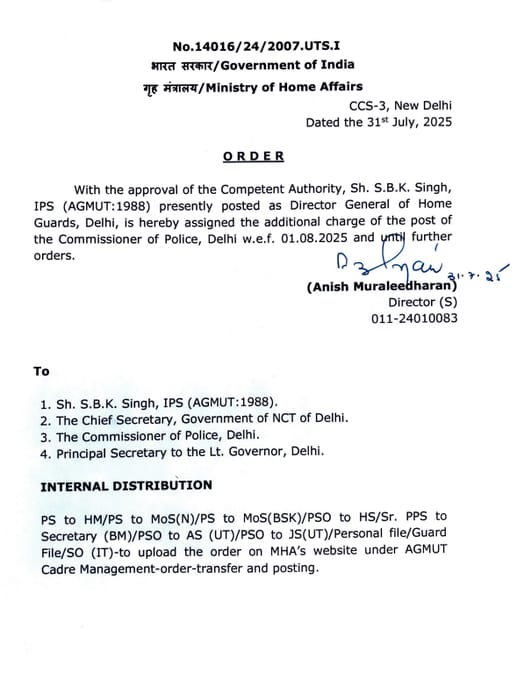 New Delhi News (31/07/2025): दिल्ली पुलिस (Delhi Police) के प्रशासनिक ढांचे में एक अहम बदलाव करते हुए केंद्र सरकार ने वरिष्ठ आईपीएस अधिकारी एस.बी.के. सिंह (S.B.K Singh) को दिल्ली के पुलिस आयुक्त का अतिरिक्त कार्यभार सौंपा है। गृह मंत्रालय द्वारा 31 जुलाई 2025 को जारी आदेश के अनुसार, एस.बी.के. सिंह 1 अगस्त 2025 से दिल्ली पुलिस आयुक्त का कार्यभार संभालेंगे। वह वर्तमान में दिल्ली होम गार्ड्स के महानिदेशक के पद पर कार्यरत हैं।