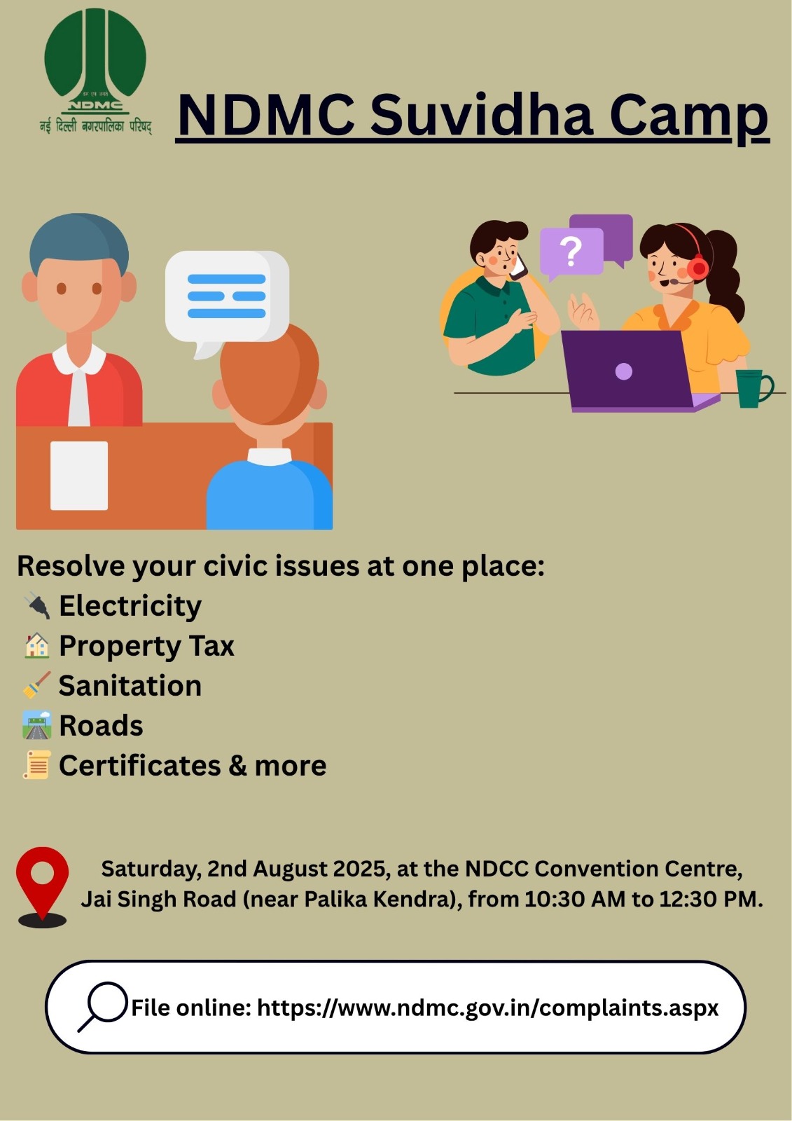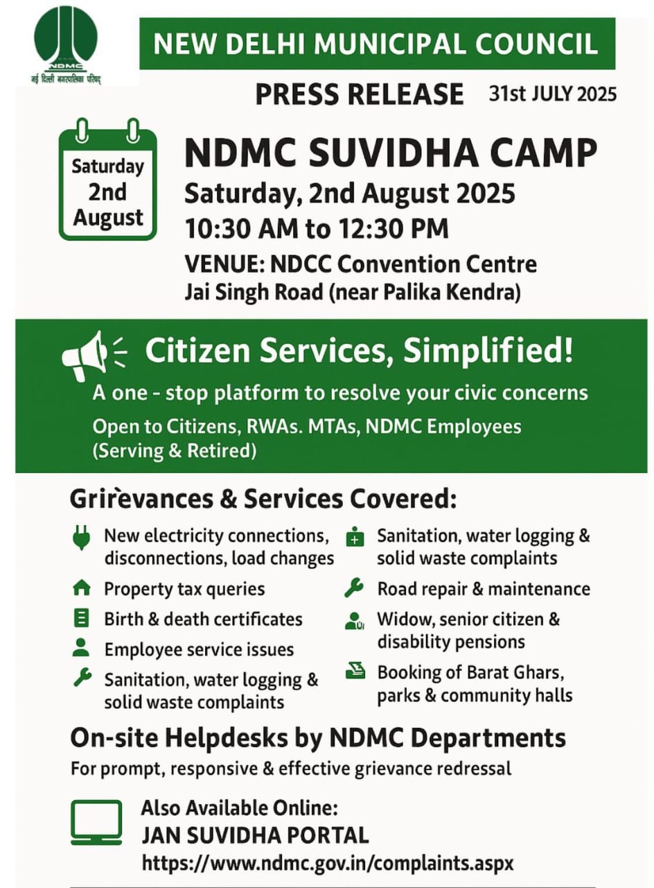 New Delhi News (01 August 2025): नई दिल्ली नगरपालिका परिषद (एनडीएमसी) नागरिकों को पारदर्शी, जवाबदेह और सहभागी प्रशासन उपलब्ध कराने की दिशा में अपनी प्रतिबद्धता के तहत शनिवार, 02 अगस्त 2025 को एनडीसीसी कन्वेंशन सेंटर, जय सिंह रोड (पालिका केंद्र के पास) में सुबह 10:30 बजे से दोपहर 12:30 बजे तक अपना मासिक सुविधा शिविर आयोजित करेगी।