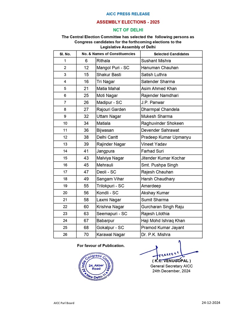कांग्रेस की नई सूची में विभिन्न वर्गों और क्षेत्रों को प्रतिनिधित्व दिया गया है। रिठाला से सुषांत मिश्रा, मंगोलपुरी (एससी) से हनुमान चौहान, शकर बस्ती से सतीश लूथरा, और त्रिनगर से सतेंद्र शर्मा जैसे उम्मीदवारों को मौका दिया गया है। मटिया महल से असीम अहमद खान और मोती नगर से राजेंद्र नामधारी मैदान में उतरेंगे।