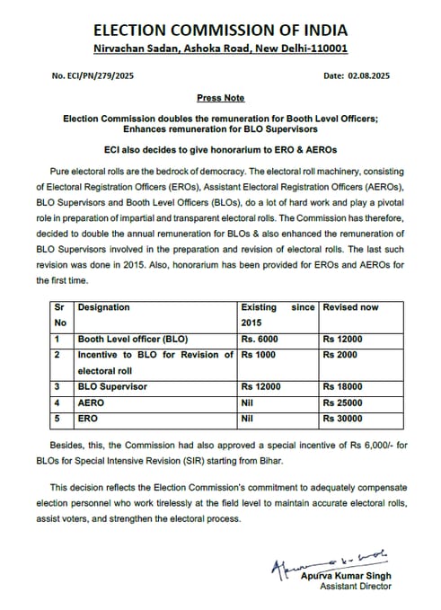 BLO का पारिश्रमिक दोगुना, ERO-AERO को पहली बार मानदेय; निर्वाचन आयोग ने लिया बड़ा फैसला