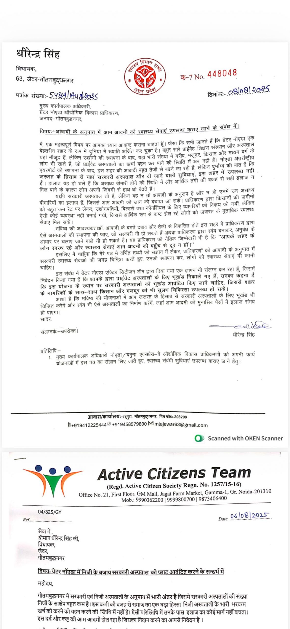जेवर विधायक धीरेन्द्र सिंह (Jewar MLA Dhirendra Singh) ने अपने पत्र में उल्लेख किया कि ग्रेटर नोएडा प्राधिकरण ने किसानों से कम दर पर भूमि लेकर औद्योगिक इकाइयों, बिल्डरों और वाणिज्यिक परियोजनाओं को तो जगह दी, लेकिन आम जनता के लिए पर्याप्त सरकारी स्वास्थ्य सुविधाएं विकसित नहीं कीं। उन्होंने सुझाव दिया कि प्राधिकरण को उपलब्ध भूमि पर प्राथमिकता से सरकारी अस्पतालों का निर्माण करना चाहिए, ताकि आम लोगों को उचित दरों पर चिकित्सा सुविधा मिल सके।