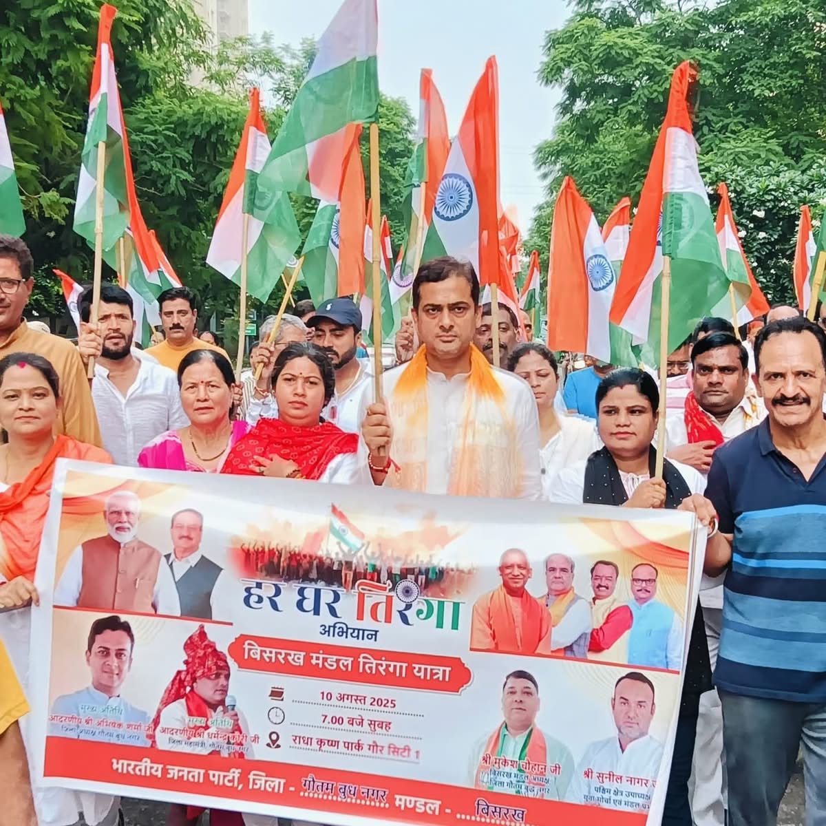 जिला अध्यक्ष अभिषेक शर्मा (District President Abhishek Sharma)ने बिसरख मंडल में आयोजित भव्य तिरंगा यात्रा में शामिल होकर राष्ट्रभक्ति और एकता का संदेश पर कहा कि यह यात्रा हर घर तिरंगा अभियान को सफल बनाने और जन-जन में देशभक्ति की भावना जगाने का संकल्प है। उन्होंने कहा देश की आज़ादी की लड़ाई में नेता जी सुभाष चन्द्र बोस, लोक मान्य तिलक, लाला लाजपतराय, चन्द्रशेखर आज़ाद, शहीद भगत सिंह, राजगुरु सुखदेव, रामप्रसाद, बिसमिल, झाँसी की रानी लक्ष्मी बाई आदि लाखों लाखों क्रान्तिकारी शहीद हुए तब जाकर देश की आज़ादी मिली। आइए, हम सभी मिलकर अपने घरों पर तिरंगा फहराकर देश के सम्मान और गर्व को नई ऊँचाइयों तक पहुँचाएँ।