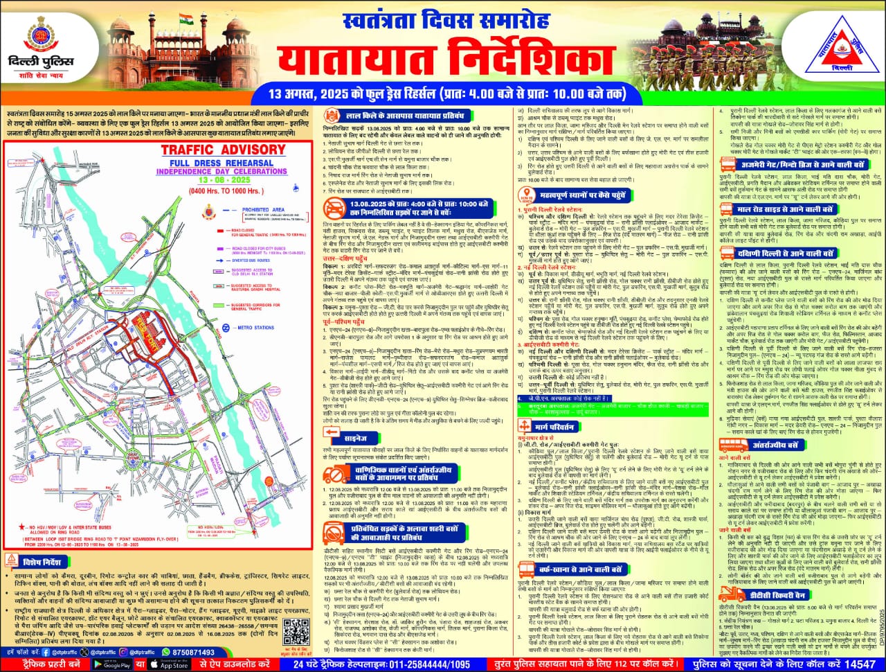 New Delhi News (12/08/2025): स्वतंत्रता दिवस समारोह की तैयारियों के तहत बुधवार, 13 अगस्त को राजधानी दिल्ली में लाल किले पर फुल-ड्रेस रिहर्सल आयोजित की जाएगी। इस मौके पर सुरक्षा और यातायात प्रबंधन के लिए दिल्ली पुलिस ने सुबह 4 बजे से 10 बजे तक कई सड़कों पर यातायात प्रतिबंध और डायवर्जन लागू करने का ऐलान किया है। पुलिस ने नागरिकों से अपील की है कि वे अनावश्यक रूप से इन इलाकों से न गुजरें और समय से पहले यात्रा की योजना बनाएं।