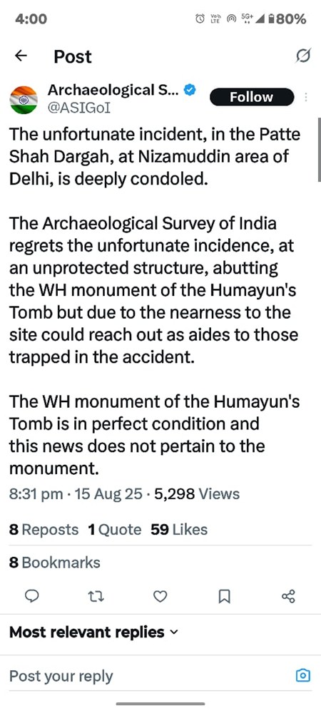 एएसआई ने अपने बयान में कहा कि 16वीं सदी का हुमायूं का मकबरा संरचनात्मक रूप से बिल्कुल सुरक्षित है और इस संबंध में फैलाई गई खबरें भ्रामक हैं। उन्होंने बताया कि यह घटना परिसर से सटे एक असुरक्षित ढांचे में हुई है, जिसका संरक्षण एएसआई के अधीन नहीं था। संस्था ने इस दुर्भाग्यपूर्ण हादसे पर गहरा खेद भी व्यक्त किया और लोगों से अफवाहों पर ध्यान न देने की अपील की।