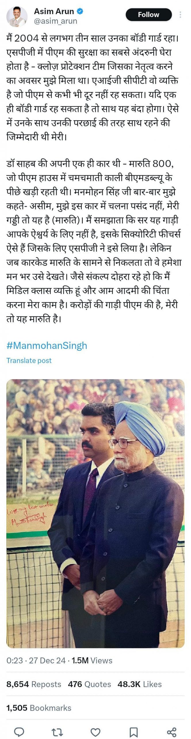 असीम अरुण ने याद किया कि मनमोहन सिंह जी के पास अपनी निजी कार, मारुति 800, थी, जो पीएम हाउस में खड़ी बीएमडब्ल्यू के पीछे दिखाई देती थी। उन्होंने बताया, “डॉ. साहब बार-बार कहते थे- ‘असीम, मुझे इस कार में चलना पसंद नहीं, मेरी गाड़ी तो यह मारुति है।’ मैंने कई बार उन्हें समझाया कि बीएमडब्ल्यू आपकी सुरक्षा के लिए जरूरी है, लेकिन जब भी उनका काफिला गुजरता और मारुति को पीछे छोड़ता, वे हमेशा उसे देख कर संकल्प लेते दिखाई देते। उनके चेहरे पर साफ झलकता कि वे अपने मिडिल क्लास मूल्यों और आम आदमी की सेवा के प्रति प्रतिबद्ध हैं।”