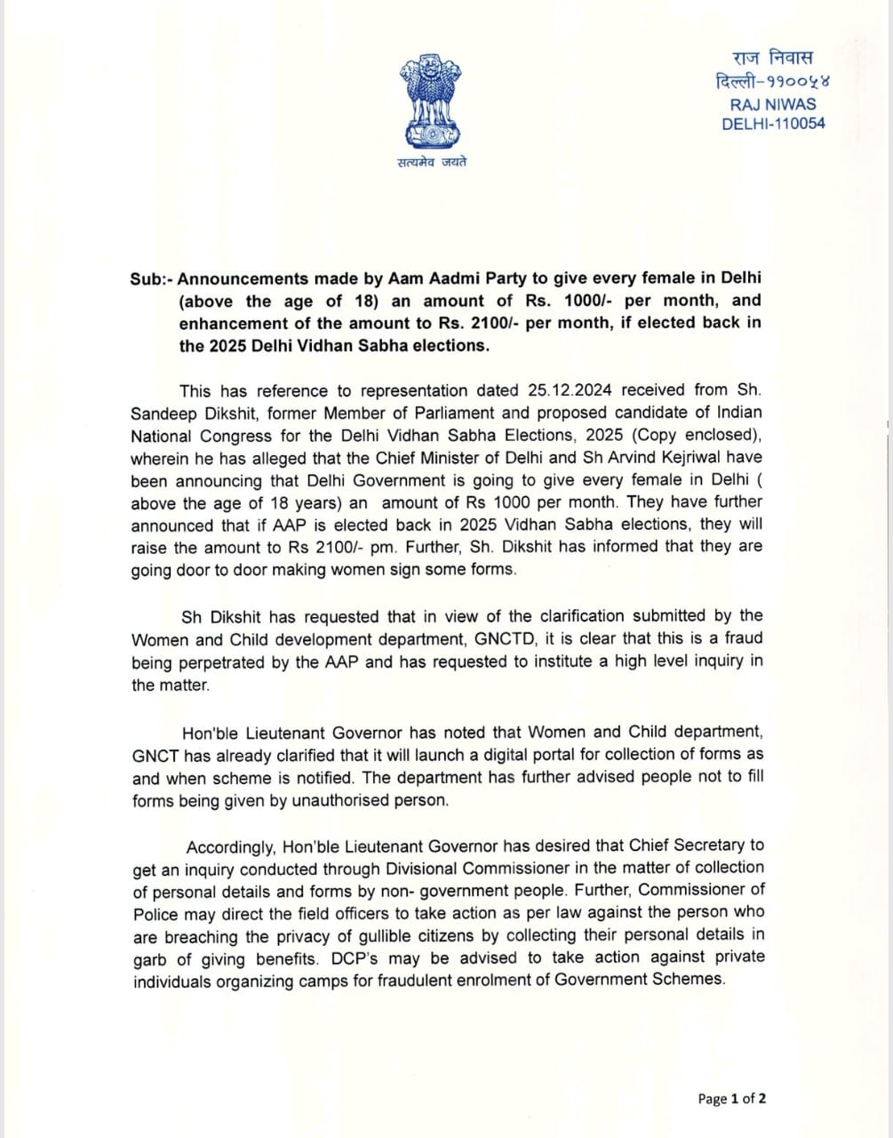 Breaking News: महिलाओं को ₹2100 प्रति महीने देने के नाम पर रजिस्ट्रेशन को लेकर एलजी का सख्त एक्शन!