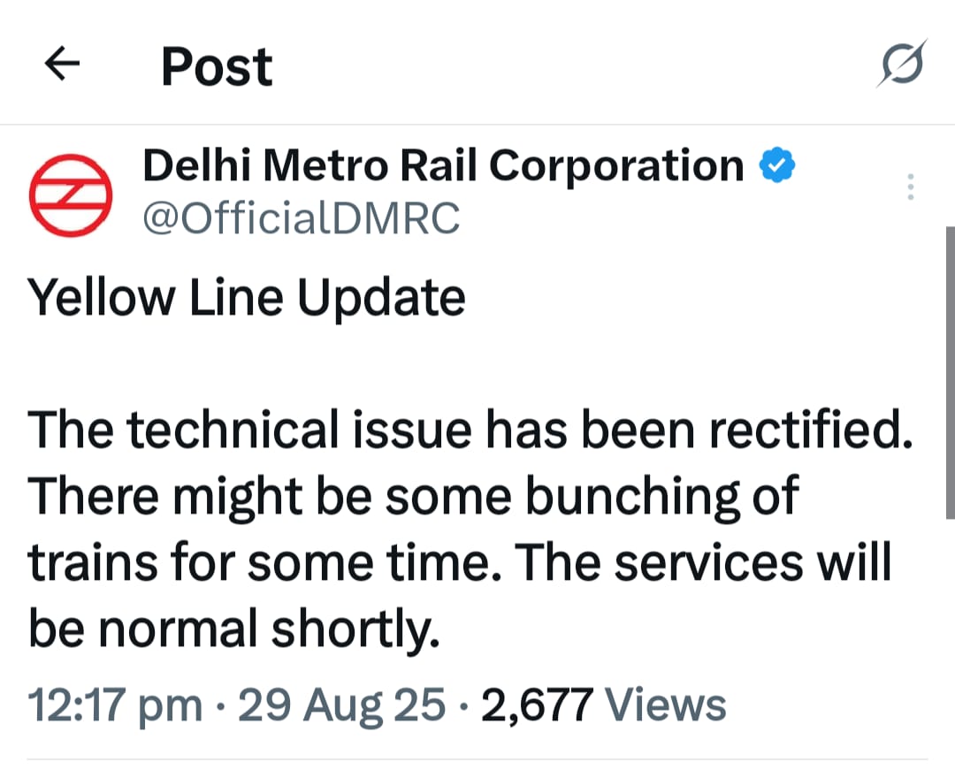 डीएमआरसी ने कहा है कि तकनीकी दिक्कतों को दूर करने के लिए टीमें लगातार काम कर रही हैं और प्रभावित खंड पर सेवाएं धीरे-धीरे पटरी पर लौट रही हैं। हालांकि सुबह की इस परेशानी ने यात्रियों को खासा प्रभावित किया और उनका दिन देर से शुरू हुआ। अब उम्मीद है कि कुछ घंटों में येलो लाइन पूरी तरह सामान्य हो जाएगी।।