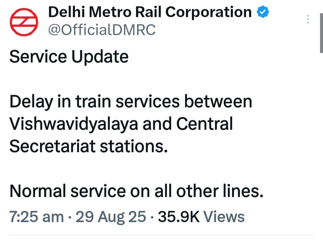 यात्रियों ने सोशल मीडिया प्लेटफॉर्म एक्स पर अपनी नाराजगी जाहिर की। एक यूजर ने लिखा कि जीटीबी नगर से विश्वविद्यालय तक पहुंचने में सामान्यतः कुछ ही मिनट लगते हैं, लेकिन आज करीब 50 मिनट लगे। दूसरे ने कहा कि कश्मीरी गेट से राजीव चौक पहुंचने में 30 मिनट लग गए। कई लोगों ने यह भी शिकायत की कि उन्हें पहले से सूचित नहीं किया गया।