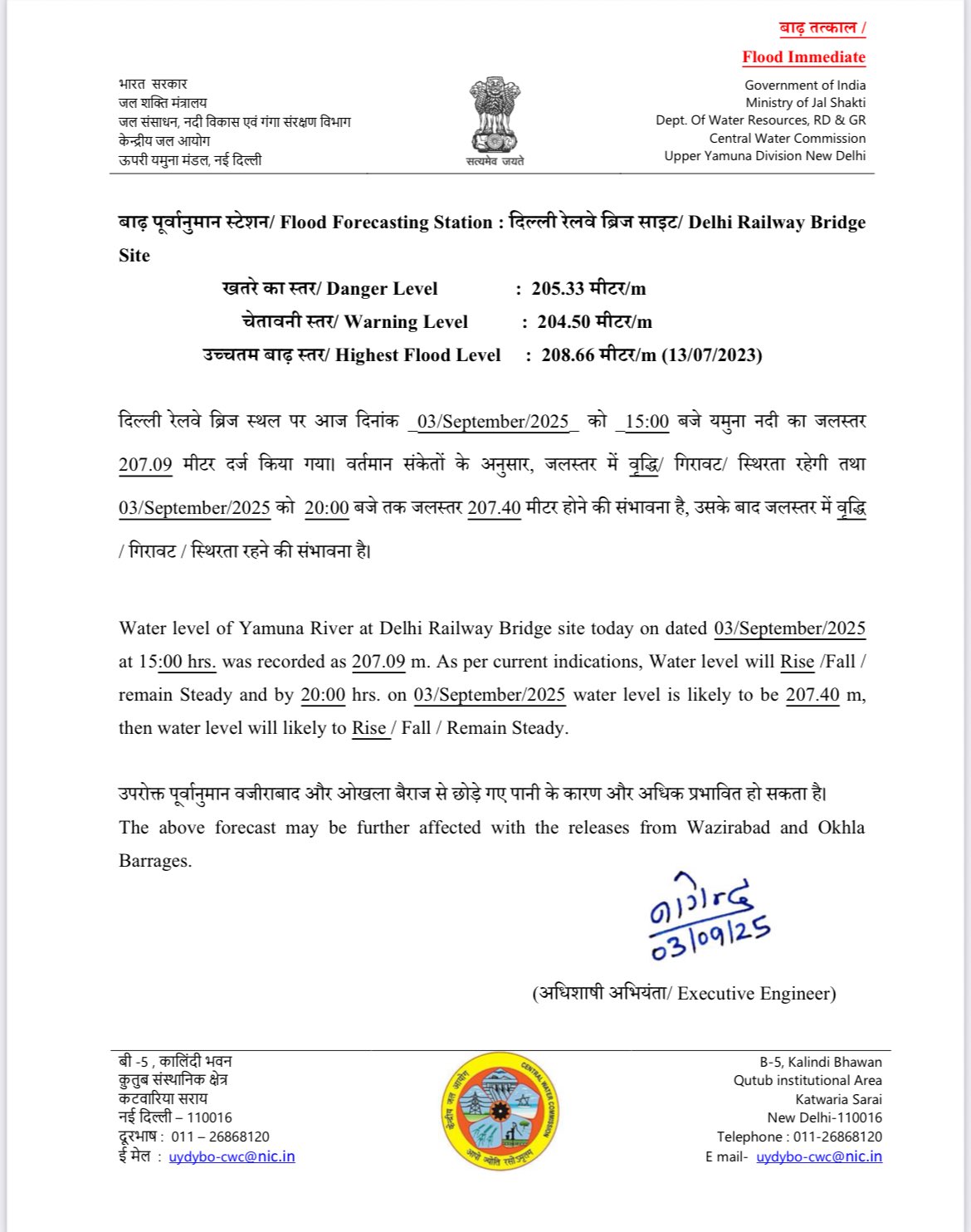 New Delhi News (03/09/2025): राजधानी दिल्ली में यमुना नदी का जलस्तर लगातार बढ़ रहा है। केंद्रीय जल आयोग (Central Water Commission) की ताज़ा रिपोर्ट के अनुसार 3 सितंबर 2025 को दोपहर 3 बजे यमुना का जलस्तर दिल्ली रेलवे ब्रिज साइट पर 207.09 मीटर दर्ज किया गया। यह स्तर खतरे के निशान 205.33 मीटर से काफी ऊपर है। रिपोर्ट में चेतावनी दी गई है कि हालात और बिगड़ सकते हैं और रात 8 बजे तक जलस्तर बढ़कर 207.40 मीटर तक पहुंचने की आशंका है।