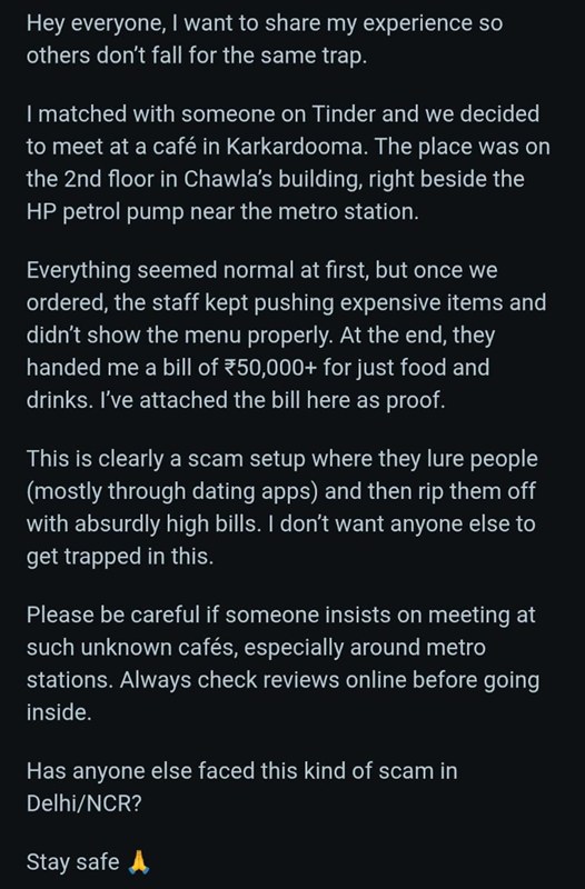 पीड़ित शख्स ने बताया कि कैफ़े स्टाफ ने मेन्यू तक ढंग से नहीं दिखाया और लगातार महंगी डिशेज़ ऑर्डर करने का दबाव बनाया। खाने के बाद जब बिल थमाया गया तो उसकी आँखें फटी रह गईं। उन्होंने सोशल मीडिया पर बिल की तस्वीर शेयर करते हुए लिखा—“यह पूरा सेटअप एक स्कैम है, जहां डेटिंग ऐप्स के ज़रिये लोगों को फंसाकर लूटा जा रहा है।”
