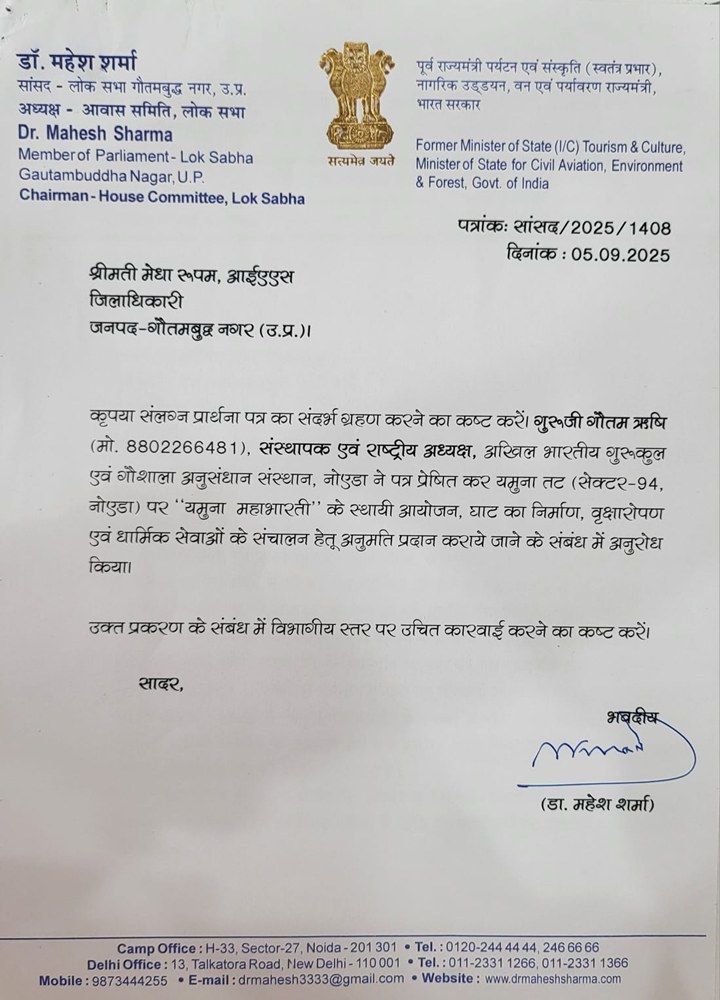 भेंट के दौरान गौ माता की सेवा एवं संरक्षण, ग्रामीण विकास, यमुना महाआरती, भारतीय सनातन संस्कृति और उसके संरक्षण जैसे अनेक महत्वपूर्ण विषयों पर गहन चर्चा हुई। डॉ. महेश शर्मा ने इन मुद्दों को लेकर गुरुजी के प्रयासों की सराहना करते हुए उन्हें पूर्ण समर्थन का आश्वासन दिया। उन्होंने स्पष्ट कहा, “जहां भी मेरी आवश्यकता होगी, मैं सदैव आपके साथ खड़ा हूँ।” सांसद डॉ महेश शर्मा ने गुरु जी के प्रस्तावों पर त्वरित संज्ञान लेते हुए जिलाधिकारी गौतमबुद्ध नगर को पत्र के माध्यम से निर्देशित किया कि, यमुना तट (सेक्टर- 94, नोएडा ) पर “यमुना महाआरती” के स्थाई आयोजन, घाट का निर्माण, वृक्षारोपण एवं धार्मिक सेवाओं के संचालन हेतु अनुमति प्रदान किया जाए और उक्त प्रकरण के संबंध में विभागीय स्तर पर उचित कार्रवाई की जाए।