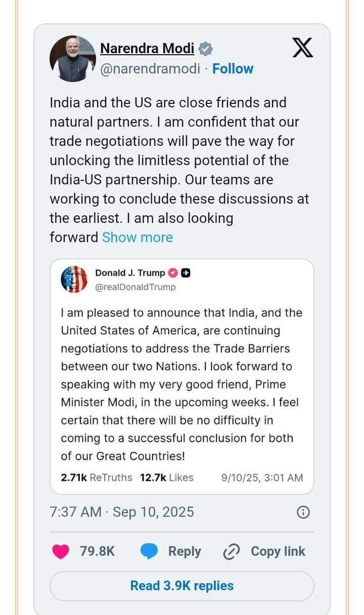 अमेरिकी राष्ट्रपति के X (पूर्व ट्विटर) पर किए गए पोस्ट का जवाब देते हुए प्रधानमंत्री मोदी ने कहा, “भारत और अमेरिका घनिष्ठ मित्र और स्वाभाविक साझेदार हैं। मुझे विश्वास है कि हमारी व्यापार वार्ताएं भारत-अमेरिका साझेदारी की असीम संभावनाओं को खोलने का मार्ग प्रशस्त करेंगी। हमारी टीमें इन चर्चाओं को शीघ्र ही अंतिम रूप देने के लिए कार्य कर रही हैं। मैं राष्ट्रपति ट्रंप से बातचीत करने की प्रतीक्षा कर रहा हूं। हम मिलकर दोनों देशों के नागरिकों के लिए एक उज्ज्वल और समृद्ध भविष्य सुनिश्चित करेंगे।”