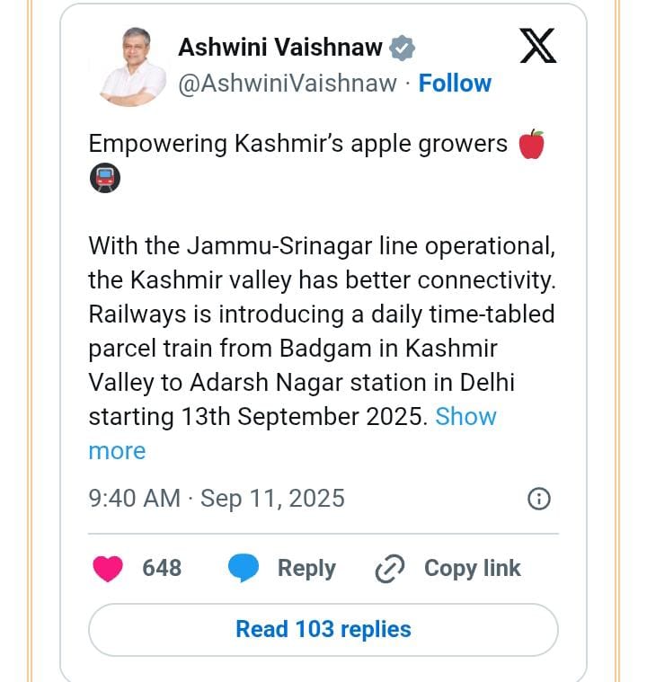 भारतीय रेल की यह पहल न केवल कश्मीर घाटी के फल उत्पादकों को बेहतर बाज़ार उपलब्ध कराएगी, बल्कि स्थानीय अर्थव्यवस्था को भी नई ऊंचाइयों तक ले जाएगी।