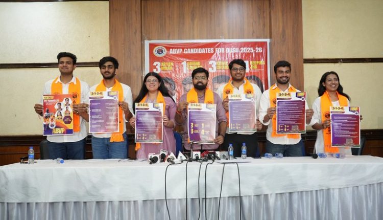 New Delhi News (13/09/2025): दिल्ली विश्वविद्यालय छात्रसंघ (DUSU) चुनाव को लेकर अखिल भारतीय विद्यार्थी परिषद (ABVP) ने अपना 11 सूत्री मैनिफेस्टो जारी कर दिया है। संगठन ने दावा किया कि यह घोषणापत्र छात्रों की सोच (Students’ Perspective) और उनके सुझावों के आधार पर तैयार किया गया है। एबीवीपी राष्ट्रीय महामंत्री वीरेंद्र सोलंकी ने कहा कि “5000 से अधिक छात्रों के सुझाव हमें प्राप्त हुए, जिसके आधार पर यह मैनिफेस्टो तैयार किया गया है।”