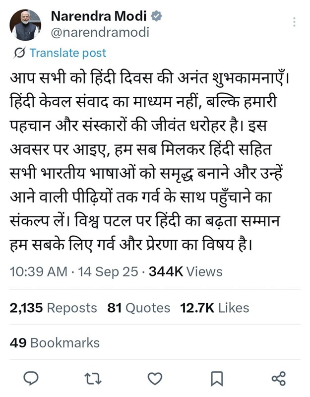 प्रधानमंत्री ने सोशल मीडिया प्लेटफॉर्म एक्स पर पोस्ट करते हुए लिखा, “आप सभी को हिंदी दिवस की अनंत शुभकामनाएं। हिंदी केवल संवाद का माध्यम नहीं, बल्कि हमारी पहचान और संस्कारों की जीवंत धरोहर है। इस अवसर पर आइए, हम सब मिलकर हिंदी सहित सभी भारतीय भाषाओं को समृद्ध बनाने और उन्हें आने वाली पीढ़ियों तक गर्व के साथ पहुचाने का संकल्प लें। विश्व पटल पर हिंदी का बढ़ता सम्मान हम सबके लिए गर्व और प्रेरणा का विषय है।”