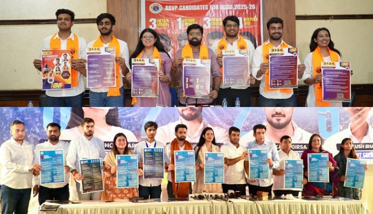 New Delhi News (15 September 2025): दिल्ली विश्वविद्यालय छात्र संघ (DUSU) के चुनाव 18 सितंबर को होने जा रहे हैं। चुनावी माहौल में अखिल भारतीय विद्यार्थी परिषद (ABVP), नेशनल स्टूडेंट्स यूनियन ऑफ इंडिया (NSUI) और वाम समर्थित SFI-AISA गठबंधन ने अपने-अपने घोषणापत्र जारी कर दिए हैं। सभी छात्र संगठनों ने शिक्षा, सुविधाओं और छात्र कल्याण को केंद्र में रखकर कई वादे किए हैं।