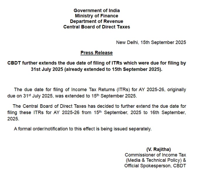 सीबीडीटी की आधिकारिक प्रवक्ता वी. राजिता ने प्रेस विज्ञप्ति में कहा कि “करदाताओं को अतिरिक्त समय देने का निर्णय लिया गया है ताकि समय पर आयकर रिटर्न फाइलिंग (ITR Filing) सुनिश्चित हो सके।”