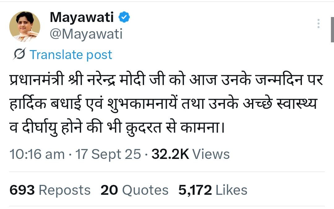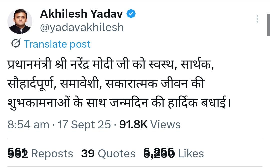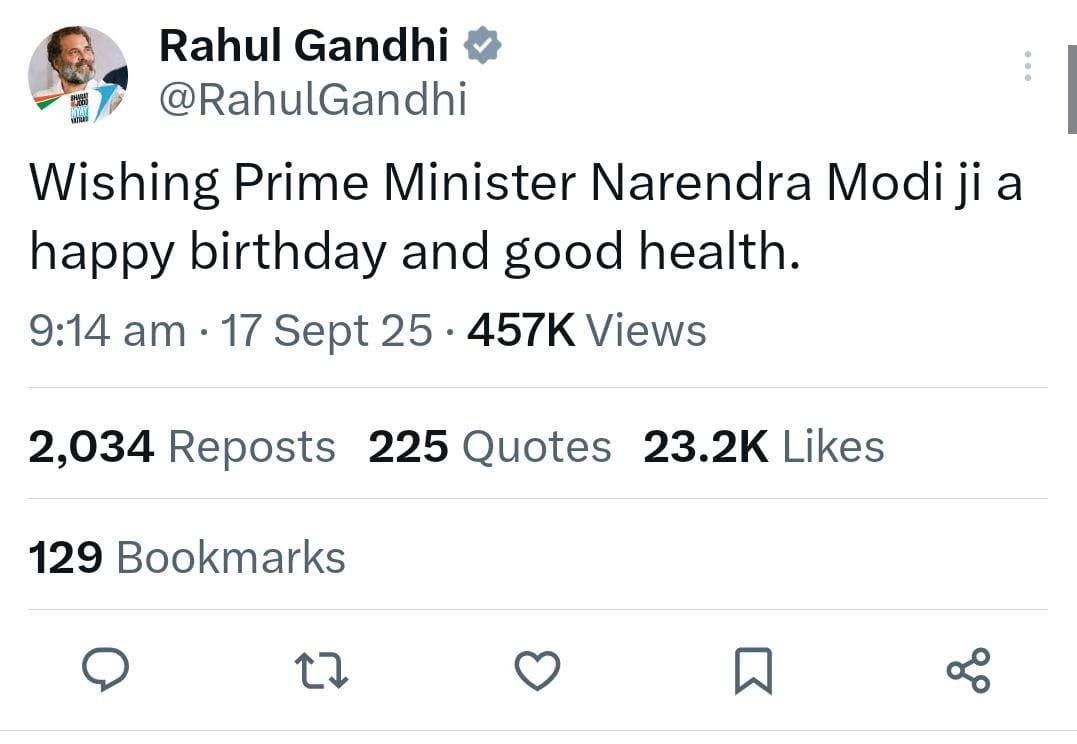 कांग्रेस नेता और लोकसभा में विपक्ष के नेता राहुल गांधी (LoP Rahul Gandhi) ने प्रधानमंत्री को शुभकामनाएं देते हुए लिखा— “विशिंग प्राइम मिनिस्टर नरेंद्र मोदी जी ए हैप्पी बर्थडे, टू गुड हेल्थ।” वहीं समाजवादी पार्टी के अध्यक्ष और उत्तर प्रदेश के पूर्व मुख्यमंत्री अखिलेश यादव (Akhilesh Yadav) ने भी बधाई संदेश साझा करते हुए कहा— “प्रधानमंत्री श्री नरेंद्र मोदी जी को स्वस्थ, सार्थक, समावेशी और सकारात्मक जीवन की शुभकामनाओं के साथ जन्मदिन की हार्दिक बधाई।”
