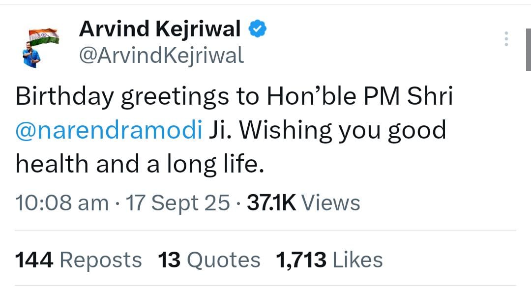 दिल्ली के पूर्व मुख्यमंत्री और आम आदमी पार्टी के राष्ट्रीय संयोजक अरविंद केजरीवाल (Arvind Kejriwal) ने प्रधानमंत्री को शुभकामनाएं देते हुए लिखा— “बर्थडे ग्रीटिंग्स टू हॉनरेबल प्राइम मिनिस्टर श्री नरेंद्र मोदी जी, विशिंग यू गुड हेल्थ एंड ए लोंग लाइफ।” वहीं बहुजन समाज पार्टी सुप्रीमो मायावती ने अपने संदेश में कहा— “प्रधानमंत्री श्री नरेंद्र मोदी जी को आज उनके जन्मदिन पर हार्दिक बधाई एवं शुभकामनाएं तथा उनके अच्छे स्वास्थ्य व दीर्घायु होने की कुदरत से कामना।”