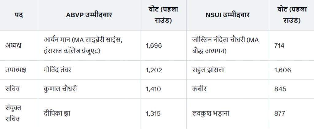 अध्यक्ष पद पर ABVP के उम्मीदवार आर्यन मान (एमए लाइब्रेरी साइंस, हंसराज कॉलेज ग्रेजुएट) ने पहले राउंड में बढ़त बना ली है। उन्हें अब तक 1,696 वोट मिले हैं, जबकि NSUI की प्रत्याशी जोस्लिन नंदिता चौधरी (एमए बौद्ध अध्ययन) को 714 वोट ही हासिल हुए हैं।
