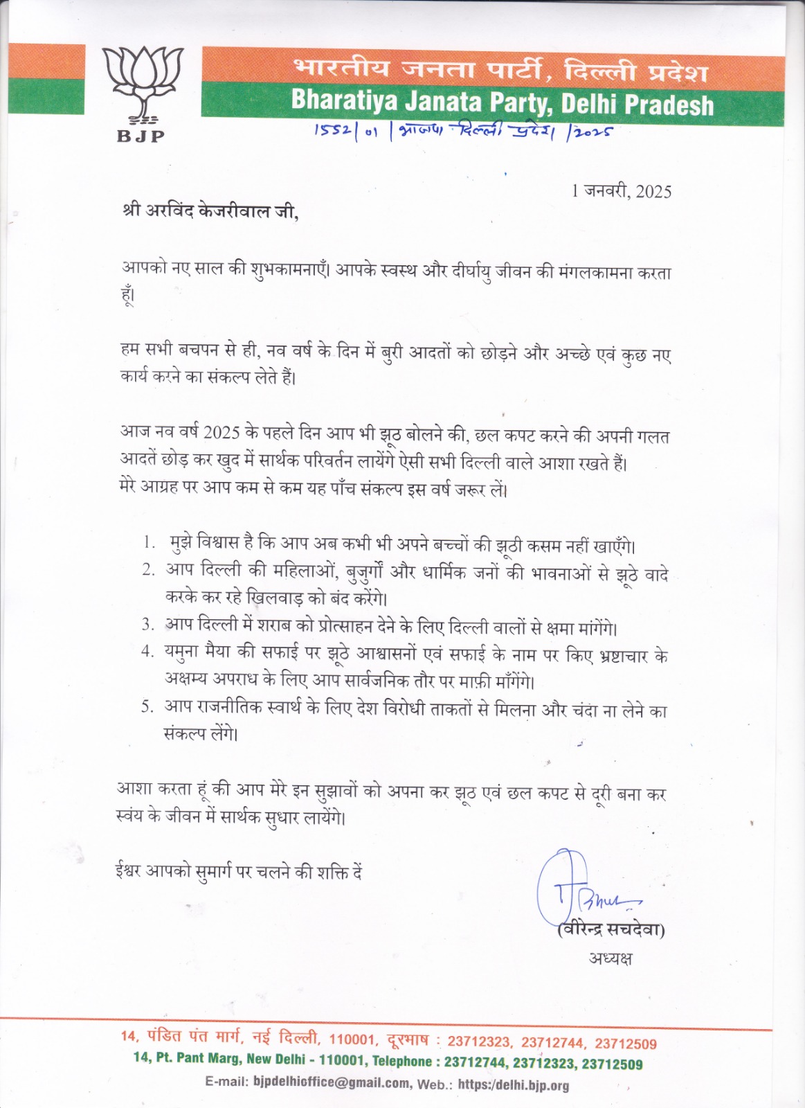 नई दिल्ली (01 जनवरी, 2025): दिल्ली बीजेपी अध्यक्ष वीरेंद्र सचदेवा ने नए साल के अवसर पर पूर्व मुख्यमंत्री अरविंद केजरीवाल को एक रजिस्टर्ड चिट्ठी लिखकर उन्हें झूठे वादों और भ्रामक दावों से बचने की नसीहत दी है। इस चिट्ठी में उन्होंने केजरीवाल को अपनी गलतियों को स्वीकार कर सुधार करने की सलाह दी।