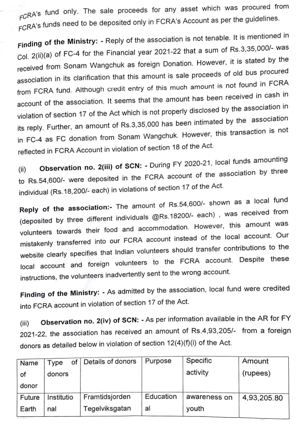 जांच में पाया गया कि वित्त वर्ष 2021-22 में संस्था ने सोनम वांगचुक से ₹3.35 लाख की राशि FCRA खाते में जमा की, जिसे मंत्रालय ने विदेशी दान की श्रेणी में गिना। संस्था का कहना था कि यह राशि एक पुराने बस की बिक्री से आई थी, जो पहले FCRA फंड से खरीदी गई थी। मगर मंत्रालय ने इसे अस्वीकार करते हुए कहा कि खाते में इसकी सही जानकारी नहीं दी गई और यह नकद जमा के रूप में आया, जो नियमों का उल्लंघन है।