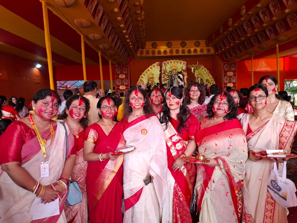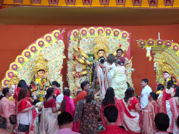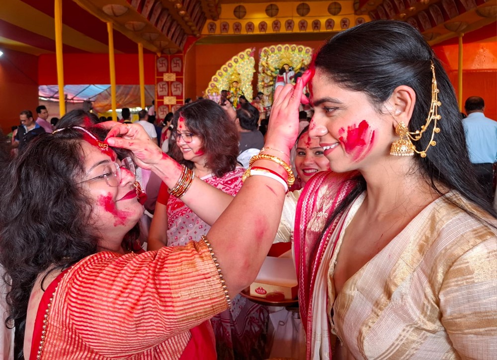 सुबह शुभ दशमी पूजा के साथ कार्यक्रम की शुरुआत हुई। बड़ी संख्या में भक्तों ने भाग लेकर माता को पुष्पांजलि अर्पित की। इसके बाद महिलाओं ने पारंपरिक सिंदूर खेला में शामिल होकर एक-दूसरे को सिंदूर लगाया और परिवारों की समृद्धि, सुख-शांति तथा दीर्घायु की मंगलकामनाएँ कीं।