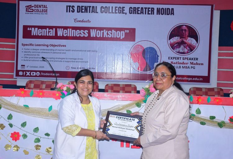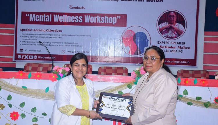 दिनांक 4 अक्टुबर, 2025 को आई0 टी0 एस0 डेंटल काॅलेज, हाॅस्प्टिल एंड रिसर्च सैंटर, ग्रेटर नोएडा में मानसिक स्वास्थ्य पर एक कार्यशाला का आयोजन किया गया जिसका उद्देश्य छात्रों, शिक्षकों एवं कर्मचारियों के बीच मानसिक स्वास्थ्य और भावानात्मक संतुलन के महत्व को समझाना तथा जीवन में आने वाले तनावों से निपटने के व्यावहारिक उपाय प्रदान करना था।