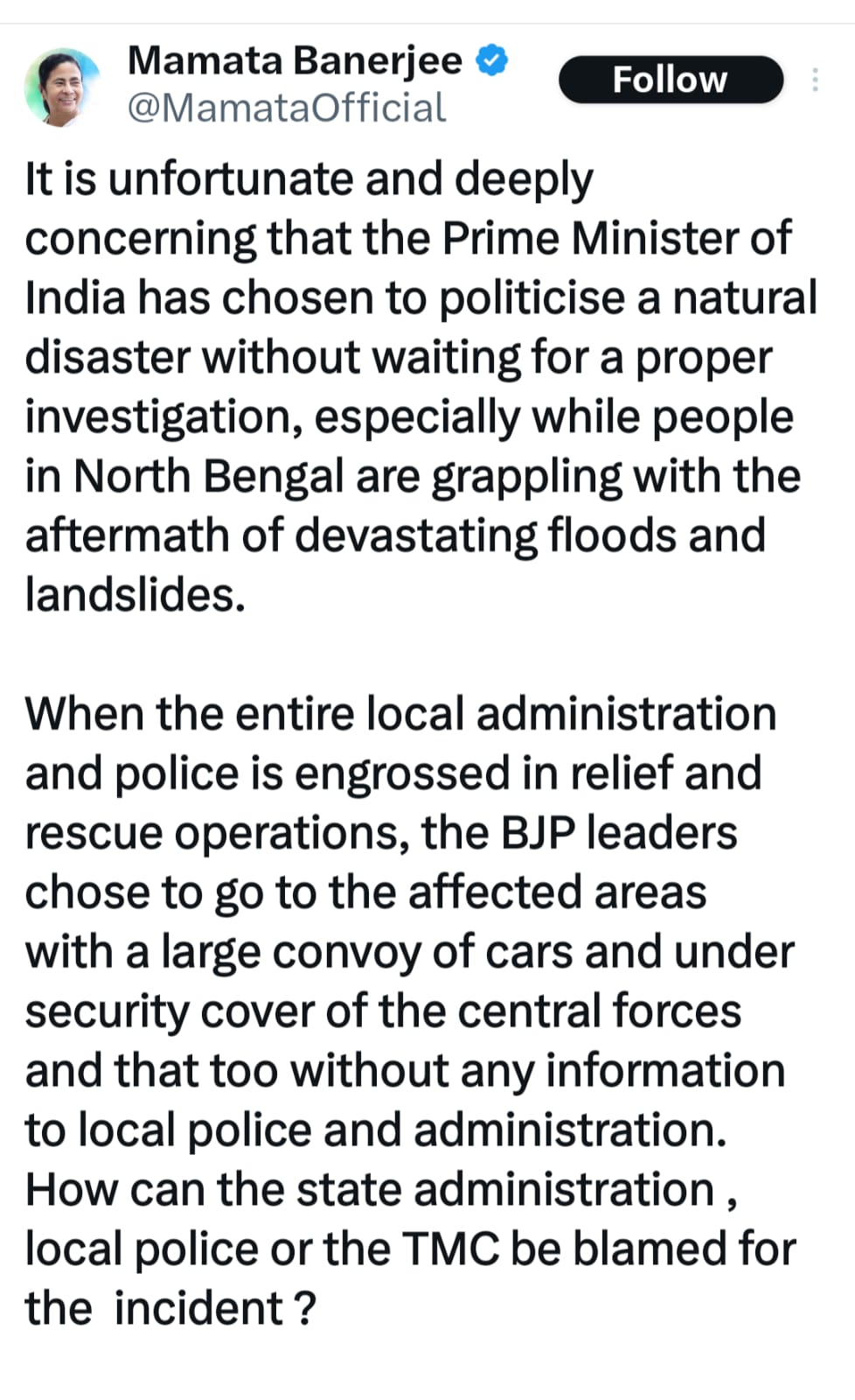 ममता बनर्जी ने अपने जवाब में मणिपुर हिंसा का उल्लेख करते हुए कहा कि “जो व्यक्ति 964 दिनों बाद मणिपुर गया, वह अब बंगाल की चिंता दिखा रहा है। यह सहानुभूति नहीं, बल्कि राजनीतिक नाटक है।” उन्होंने प्रधानमंत्री से अपील की कि वे केवल अपनी पार्टी के सहयोगियों की नहीं, बल्कि राज्य सरकार की भी बात सुनें। मुख्यमंत्री ने कहा कि यह समय एकता और राहत कार्यों का है, न कि राजनीतिक आरोप-प्रत्यारोप का।