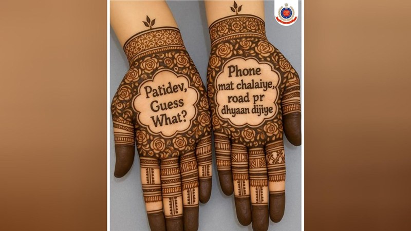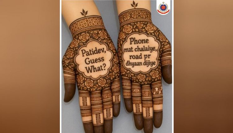 New Delhi News (10 October 2025): करवा चौथ के मौके पर दिल्ली पुलिस ने लोगों को शुभकामनाएं देने के साथ-साथ यातायात नियमों के प्रति जागरूक करने का रचनात्मक तरीका अपनाया। पुलिस ने अपने आधिकारिक सोशल मीडिया हैंडल ‘एक्स’ (पूर्व ट्विटर) पर एक पोस्ट साझा किया, जिसमें एक महिला के एक हथेली में लगी मेहंदी पर लिखा है “Patidev Guess What” और दूसरी हथेली पर लिखा है “Phone mat chlaiye, road par dhyan dijiye।” यह पोस्ट सोशल मीडिया पर तेजी से वायरल हो गई और लोगों ने इसे सराहा।