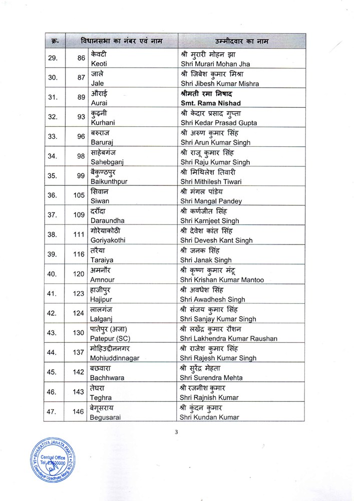 जारी सूची के अनुसार, बेतिया से रेणु देवी, रक्सौल से प्रमोद कुमार सिंह, पिपरा से श्याम बाबू प्रसाद यादव, मधुबन से रणार्धन रणधीर सिंह, मोतिहारी से प्रमोद कुमार, ढाका से पवन जयसवाल, रीवा से बैद्यनाथ प्रसाद, बथनाहा से अनिल कुमार राम, परिहार से गायत्री देवी और सीतामढ़ी से सुनील कुमार पिंटू को उम्मीदवार बनाया गया है।