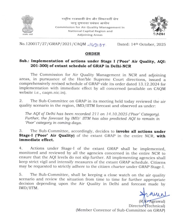 New Delhi News (14 October 2025): दिल्ली-एनसीआर में बढ़ते प्रदूषण स्तर को देखते हुए कमीशन फॉर एयर क्वालिटी मैनेजमेंट (CAQM) ने ग्रैप (Graded Response Action Plan) के पहले चरण (Stage-I) को तत्काल प्रभाव से लागू करने का आदेश जारी किया है। 14 अक्टूबर 2025 को जारी आदेश के अनुसार दिल्ली का एयर क्वालिटी इंडेक्स (AQI) 211 दर्ज किया गया, जो ‘Poor Category’ में आता है। आयोग ने कहा कि मौसम विभाग के अनुमान के अनुसार आने वाले दिनों में वायु गुणवत्ता और खराब हो सकती है, इसलिए प्रदूषण नियंत्रण के लिए प्रारंभिक कदम उठाए जा रहे हैं।
