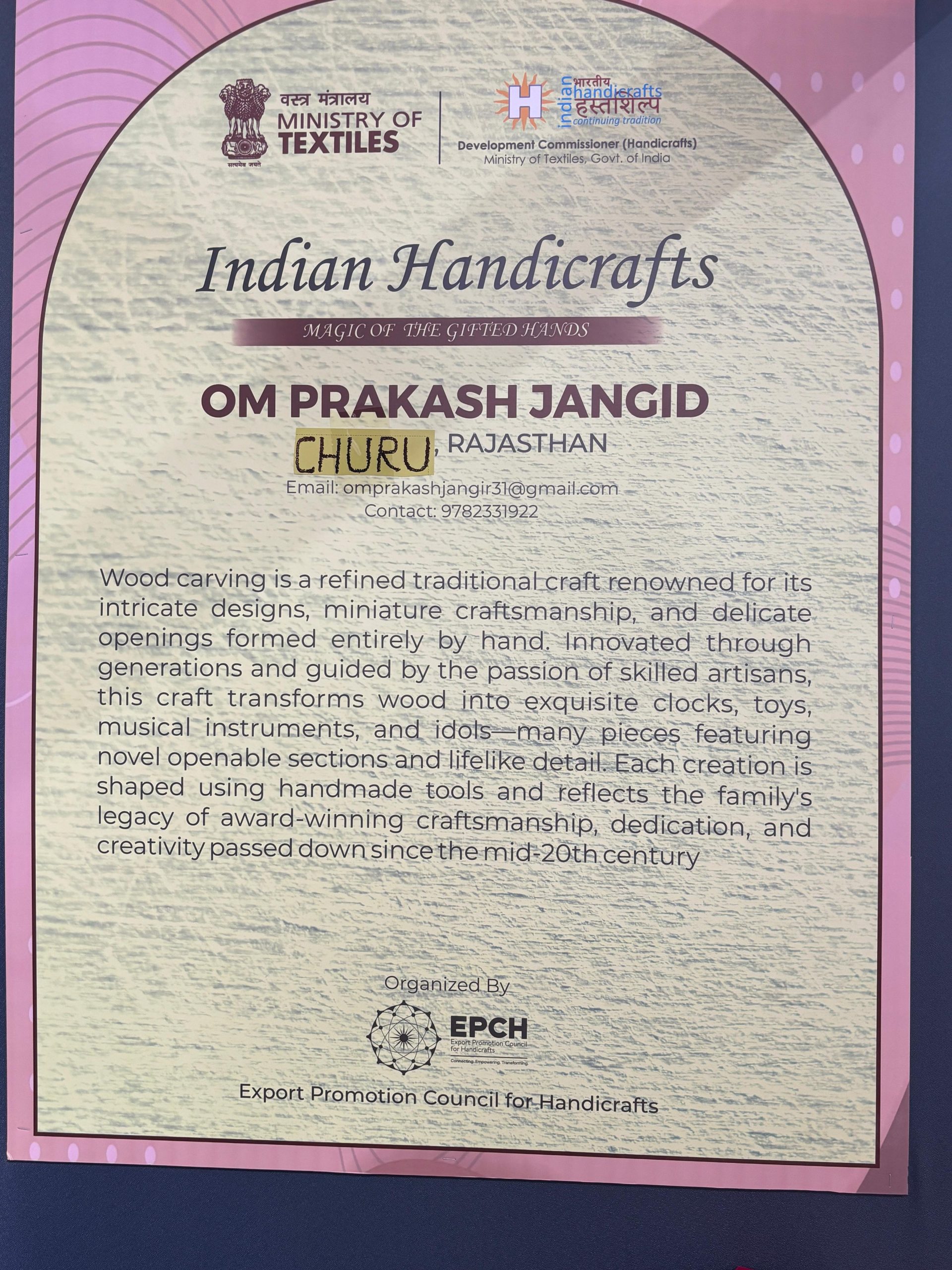 इन्हीं अद्भुत प्रतिभाओं में एक नाम है राजस्थान के निवासी मालजी कलाकार ओमप्रकाश जांगिड़ का, जिन्होंने अपनी विलक्षण कला से उपस्थित दर्शकों को चकित कर दिया। सामान्यतः जहाँ एक साधारण नारियल का मूल्य ₹50 से ₹80 तक होता है, वहीं ओमप्रकाश जांगिड़ द्वारा प्रदर्शित एक विशेष नारियल का मूल्य ₹25,000 आँका गया है। यह सुनकर कोई भी आश्चर्यचकित हो सकता है कि भला एक नारियल इतना मूल्यवान कैसे हो सकता है? परन्तु जब उस नारियल को देखा जाता है, तब ज्ञात होता है कि उसकी प्रत्येक रचना के भीतर समर्पण, श्रद्धा और भारतीय शिल्प कौशल की अद्भुत झलक निहित है।