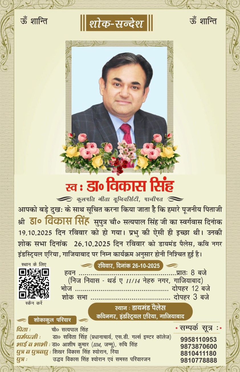 Gaziabad News (22 October 2025): भारत के उच्च शिक्षा जगत में नवाचार, दृष्टि और नेतृत्व का प्रतीक रहे प्रोफेसर डॉ. विकास सिंह अब हमारे बीच नहीं रहे। 19 अक्टूबर 2025 को नई दिल्ली के सर गंगाराम अस्पताल में हृदयाघात (Heart Attack) के कारण उनका निधन हो गया। वे पिछले कुछ वर्षों से कैंसर जैसी घातक व्याधि से संघर्षरत थे, परन्तु अपने अदम्य साहस और अटूट मनोबल से उन्होंने दो बार कैंसर को परास्त किया था। किंतु अंततः जीवन की अंतिम लड़ाई में हृदयाघात ने इस जुझारू शिक्षाविद को हमसे छीन लिया।