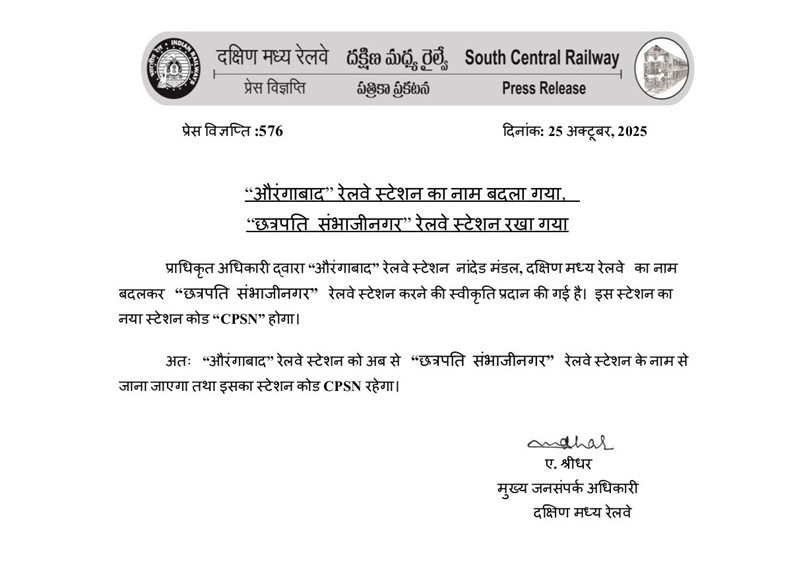 Aurangabad News (26 October 2025): दक्षिण मध्य रेलवे ने बड़ा प्रशासनिक फैसला लेते हुए “औरंगाबाद” रेलवे स्टेशन का नाम बदल दिया है। अब इस स्टेशन को “छत्रपति संभाजीनगर” रेलवे स्टेशन के नाम से जाना जाएगा। रेलवे के अधिकृत अधिकारी द्वारा जारी प्रेस विज्ञप्ति के अनुसार, नांदेड मंडल के अंतर्गत आने वाले इस स्टेशन के नाम परिवर्तन को औपचारिक मंजूरी मिल गई है। साथ ही स्टेशन का नया कोड “CPSN” निर्धारित किया गया है, जो सभी रेलवे रिकॉर्ड और टिकट बुकिंग सिस्टम में अपडेट किया जाएगा।