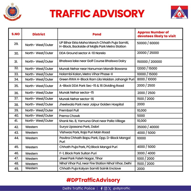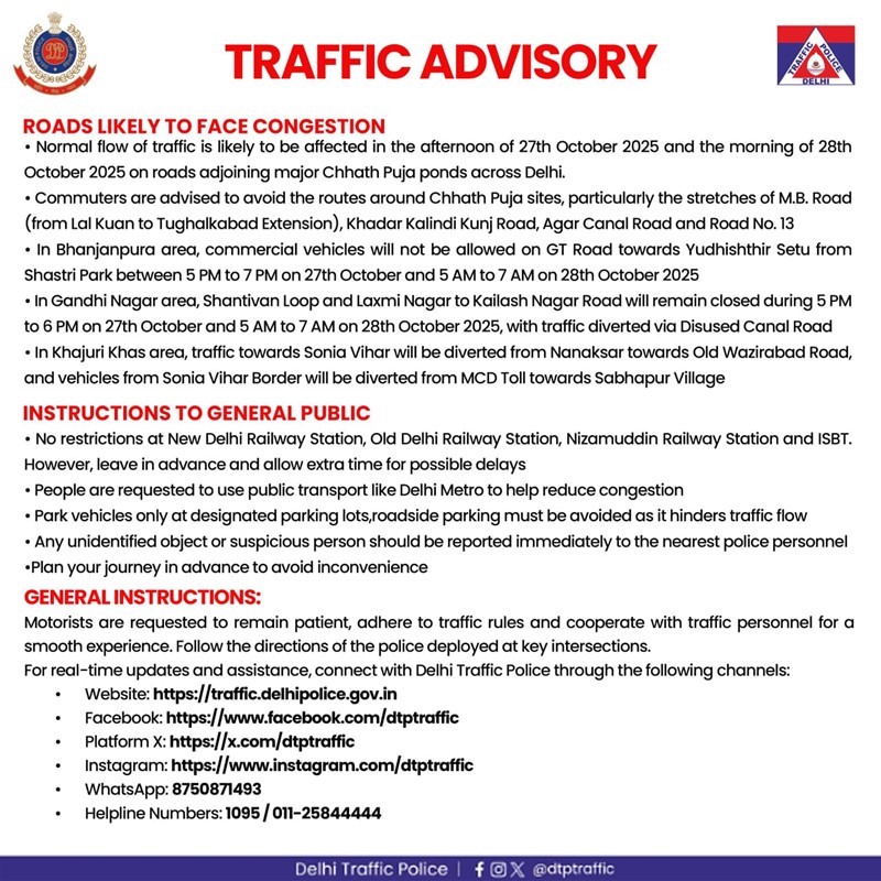 ट्रैफिक पुलिस ने यह भी बताया कि नई दिल्ली, पुरानी दिल्ली और निजामुद्दीन रेलवे स्टेशन तथा आईएसबीटी जैसे प्रमुख स्थानों पर कोई रोक नहीं होगी। रीयल-टाइम अपडेट के लिए नागरिक दिल्ली ट्रैफिक पुलिस की वेबसाइट, एक्स, फेसबुक, इंस्टाग्राम और व्हाट्सऐप हेल्पलाइन नंबरों पर जानकारी प्राप्त कर सकते हैं। पुलिस ने जनता से संयम और सहयोग की अपील की है ताकि त्योहार के दौरान यातायात सुचारू रूप से चलता रहे।।