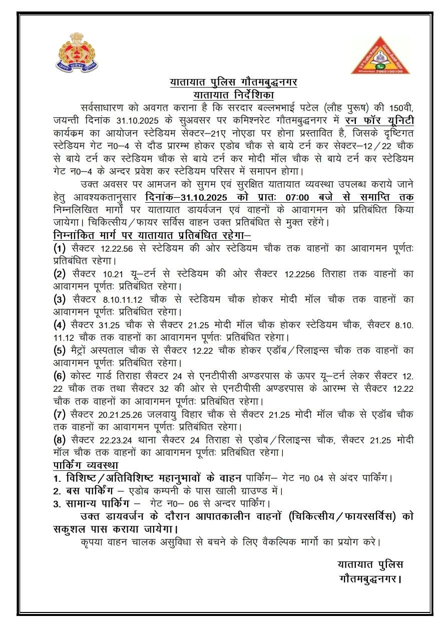सरदार पटेल जयंती पर “रन फॉर यूनिटी” कार्यक्रम के मद्देनजर नोएडा में यातायात डायवर्जन