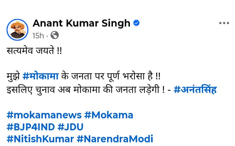 अनंत सिंह की गिरफ्तारी के बाद बिहार की सियासत में नया मोड़ आ गया है। इस बीच उनके आधिकारिक फेसबुक अकाउंट से एक पोस्ट सामने आई है जो सोशल मीडिया पर तेजी से वायरल हो रही है। अपनी पोस्ट में अनंत सिंह ने लिखा — “सत्यमेव जयते!! मुझे मोकामा की जनता पर पूर्ण भरोसा है!! इसलिए चुनाव अब मोकामा की जनता लड़ेगी!!”