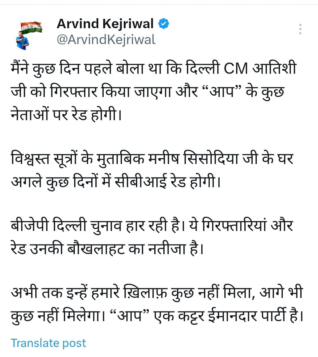 केजरीवाल ने एक ट्वीट में लिखा, “मैंने कुछ दिन पहले बोला था कि दिल्ली CM आतिशी जी को गिरफ्तार किया जाएगा और ‘आप’ के कुछ नेताओं पर रेड होगी। विश्वस्त सूत्रों के मुताबिक मनीष सिसोदिया जी के घर अगले कुछ दिनों में सीबीआई रेड होगी। बीजेपी दिल्ली चुनाव हार रही है। ये गिरफ्तारियां और रेड उनकी बौखलाहट का नतीजा है।”