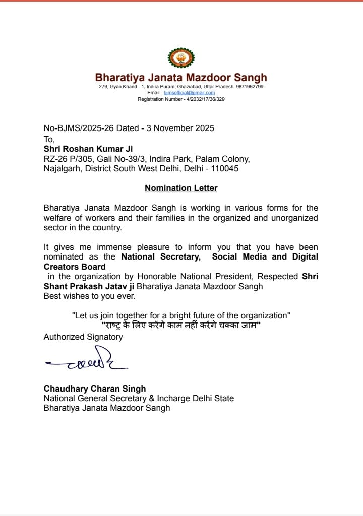 Delhi News (03/11/2025): भारतीय जनता मजदूर संघ (Bharatiya Janata Mazdoor Sangh) में एक महत्वपूर्ण और प्रेरणादायक नियुक्ति की गई है। राष्ट्रीय अध्यक्ष शान्त प्रकाश जाटव के मार्गदर्शन एवं नेतृत्व में, युवा और प्रतिभाशाली कार्यकर्ता रोशन कुमार को संगठन के राष्ट्रीय सचिव सोशल मीडिया एवं डिजिटल क्रिएटर्स बोर्ड पद की जिम्मेदारी (Responsibility) सौंपी गई है। यह नियुक्ति संगठन के डिजिटल मिशन को नई दिशा और मजबूती देने की दिशा में एक बड़ा कदम माना जा रहा है।