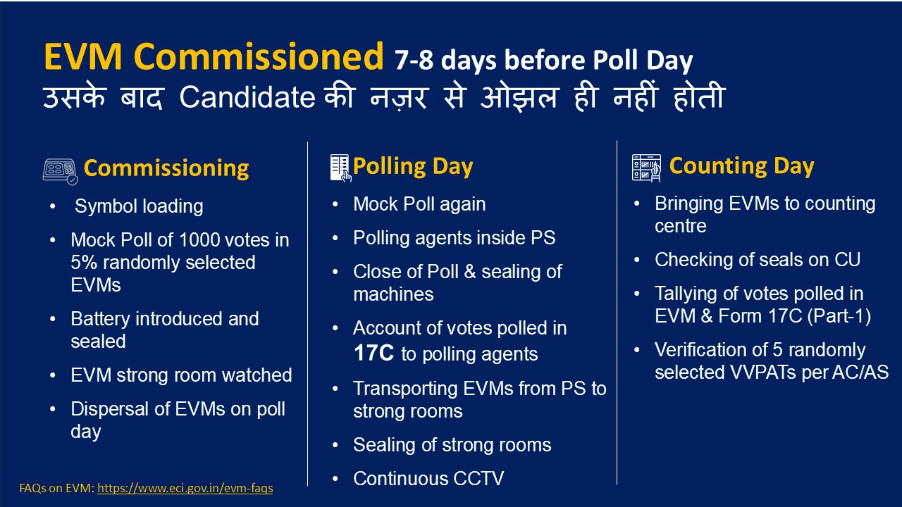 मुख्य चुनाव आयुक्त ने कहा कि उनके सामने ही उसी दिन बैट्री लगाई जाती है उसे सील की जाती है उसका जांच किया जाता है फिर उसे स्ट्रांग रूम में रखा जाता है। फिर मतदान के दिन पोलिंग स्टेशन पर इसकी जांच की जाती है, उसका वेरिफिकेशन किया जाता है। और फिर चुनाव के मतगणना के समय भी उसकी जांच की जाती है। हर प्रक्रिया में पूरी पारदर्शिता के साथ जांच की जाती है।