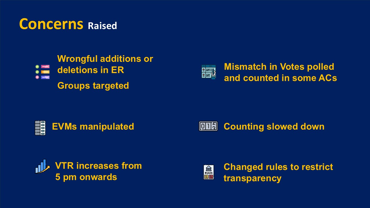 मुख्य चुनाव आयुक्त ने अपने जवाब में कहा कि, कुछ लोगों द्वारा आरोप लगाए गए कि चुनाव में मतदान में धांधली हुई और फिर मतगणना के दौरान धांधली के आरोप लगाए गए। इन सभी आरोपों का जवाब देते हुए मुख्य चुनाव आयुक्त ने विस्तार पूर्वक बताया कि किस तरह से पारदर्शिता पूर्ण चुनाव ही हमारी प्रथम प्राथमिकता है। आगे उन्होंने मतदाता सूची में नाम जोड़ने और हटाने के आरोपों का भी जवाब दिया। उन्होंने बताया कि हर साल अक्टूबर में वार्षिक SSR शुरू होता है। जिसकी कॉपी निशुल्क राजनीतिक पार्टियों को दी जाती है और उनसे सभी मुद्दों पर बातचीत की जाती है। ये पूरी प्रक्रिया हर साल होता है। उन्होंने आगे कहा कि आप सोचिए जहां एक एक वोट की लड़ाई होती है तो वहां से यदि 50 हजार लोगों के नाम काट दिए जाए जिसका आरोप लगता है तो सोचिए क्या स्थिति बन जाएगी। और यदि कहीं कुछ ऐसा होता है तो इसके सुधार के पर्याप्त समय दिए जाते हैं।