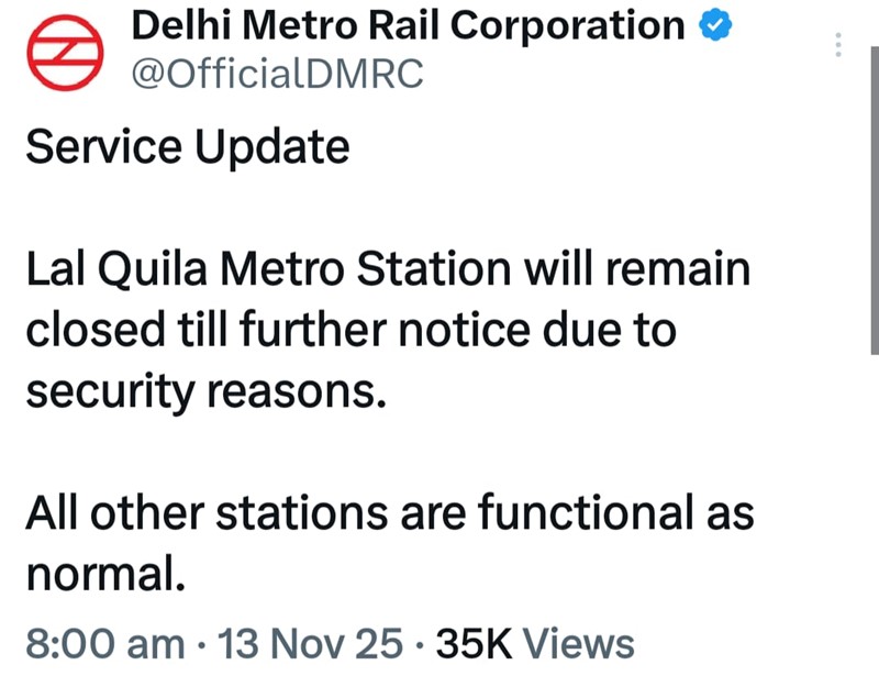 डीएमआरसी के अनुसार, लाल किला स्टेशन पर प्रवेश और निकास दोनों को अस्थायी रूप से निलंबित कर दिया गया है। जब तक संबंधित सुरक्षा एजेंसियों से अनुमति नहीं मिलती, तब तक स्टेशन बंद रहेगा। मेट्रो के अन्य सभी स्टेशन और लाइनें पूर्व निर्धारित समय-सारणी के अनुसार संचालित हो रही हैं। डीएमआरसी ने यात्रियों से अपील की है कि वे अपनी यात्रा योजनाओं में आवश्यक बदलाव करें और यात्रा से पहले नवीनतम अपडेट पर ध्यान दें।