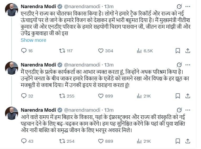 उन्होंने एनडीए के कार्यकर्ताओं को भी धन्यवाद दिया। प्रधानमंत्री ने कहा कि कार्यकर्ताओं ने अथक मेहनत और समर्पण के साथ जनता के बीच जाकर विकास की नीतियों को प्रस्तुत किया और विपक्ष के हर झूठ का मजबूती से जवाब दिया। मोदी ने लिखा कि हर कार्यकर्ता का योगदान इस जीत में अहम भूमिका निभाता है और वह उनके प्रयासों की हृदय से सराहना करते हैं।