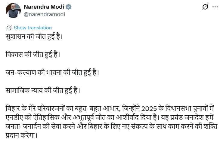 New Delhi News (14 November 2025): बिहार विधानसभा चुनाव 2025 में एनडीए की ऐतिहासिक बढ़त के बीच प्रधानमंत्री नरेंद्र मोदी ने सोशल मीडिया पर लगातार पोस्ट करते हुए जनता का आभार व्यक्त किया। उन्होंने कहा कि यह जीत सुशासन, विकास, जन-कल्याण और सामाजिक न्याय की जीत है। प्रधानमंत्री ने बिहार की जनता को “अभूतपूर्व जनादेश” देने के लिए धन्यवाद दिया और कहा कि यह आशीर्वाद उन्हें और अधिक ताकत के साथ जनता की सेवा करने का अवसर देगा।